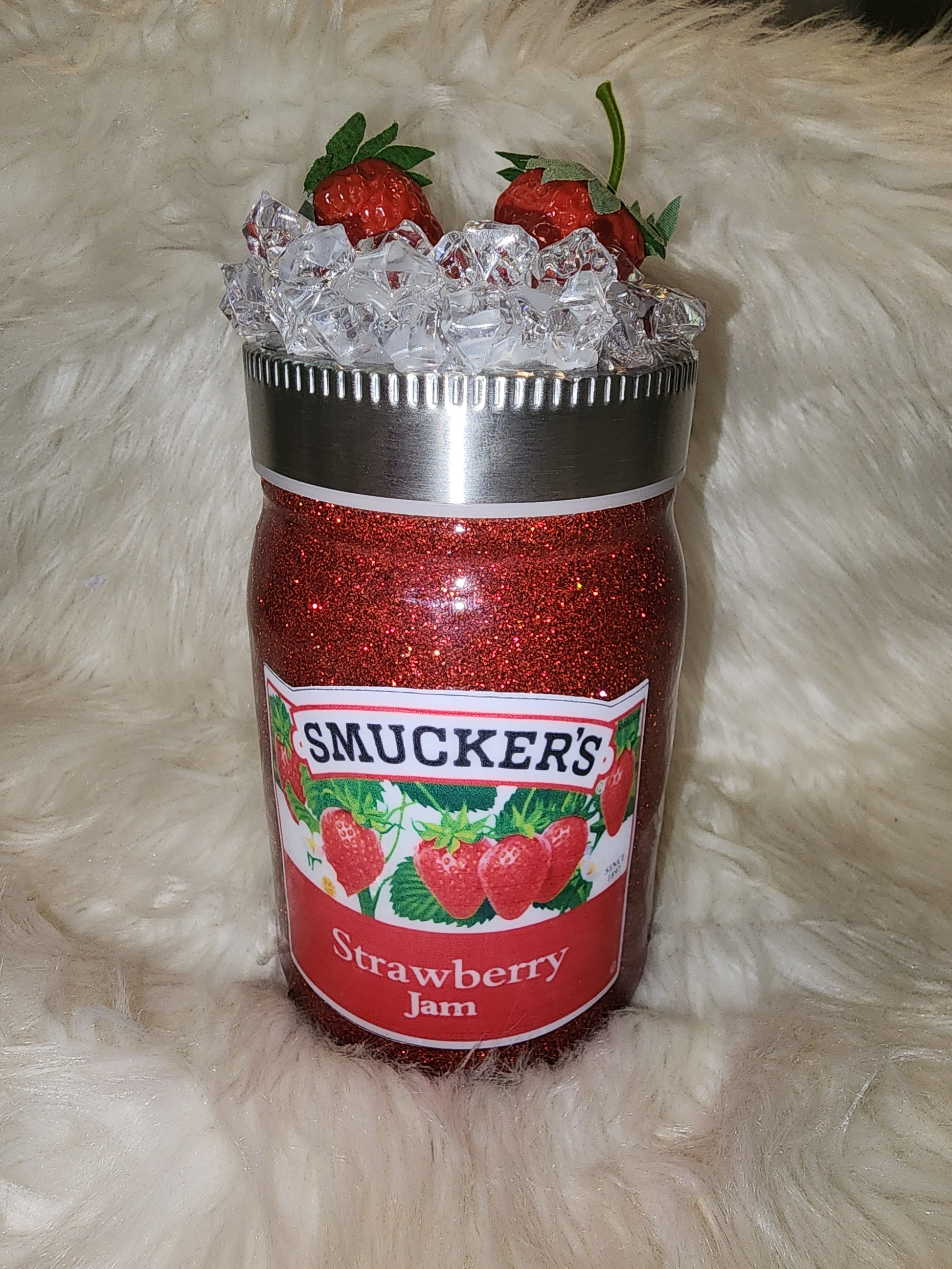 She is a 16oz mason jar tumbler coated in red glitter. She is made to look like a jam jar! She does have a topper coated in epoxy